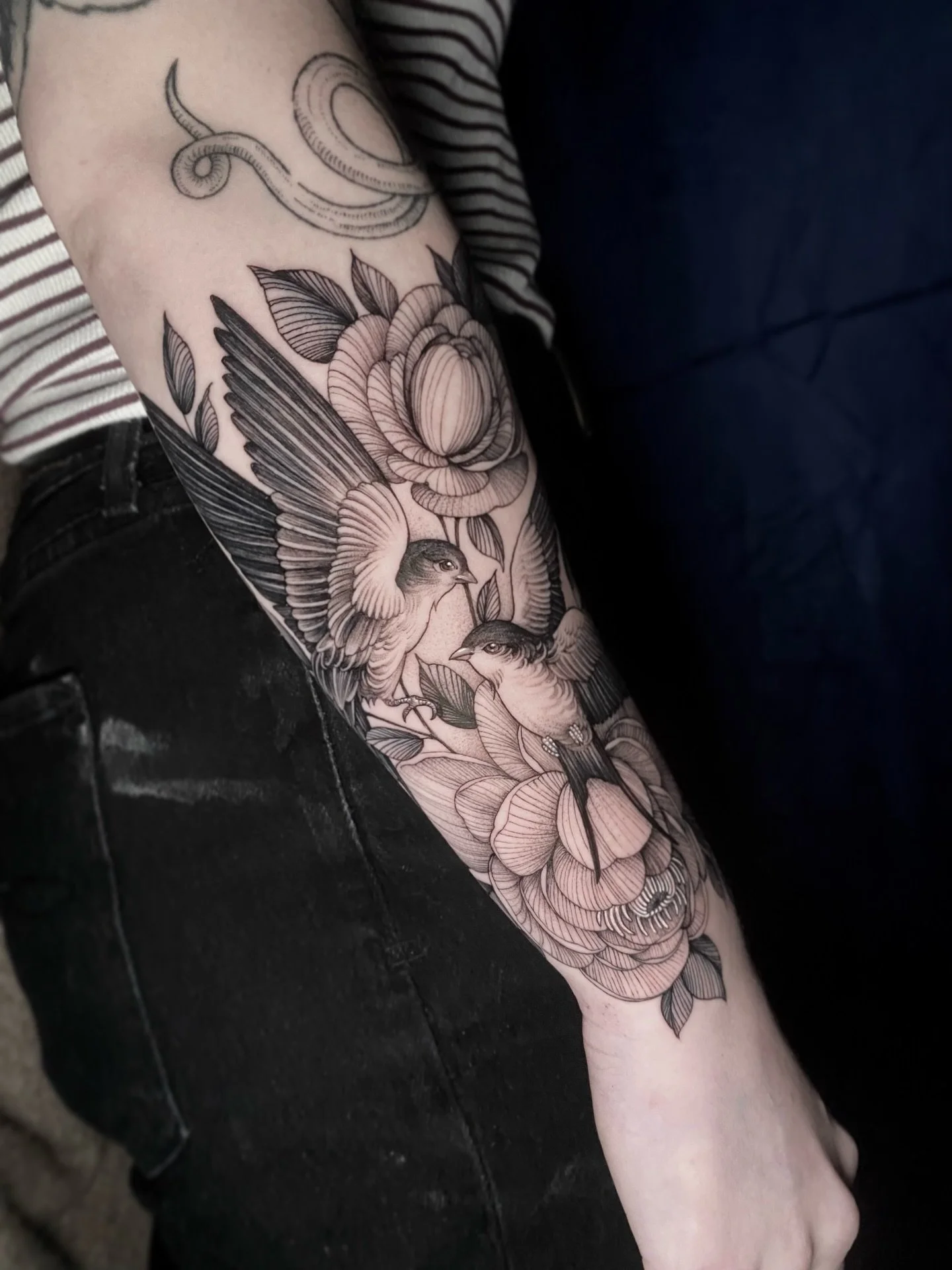 I specialize in floral and botanical designs, portraits, animals and whimsical creatures, and themes of fantasy, celtic, medieval, and witchcraft. I also love working on spooky and macabre designs, elegant lady portraits, intricate cover-ups, and nature, wildlife, and landscape pieces.
